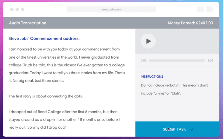 Remotasks is a micro jobs site where you can earn money by doing simple tasks like transcribing audio files, image tagging, moderating contents and so on.